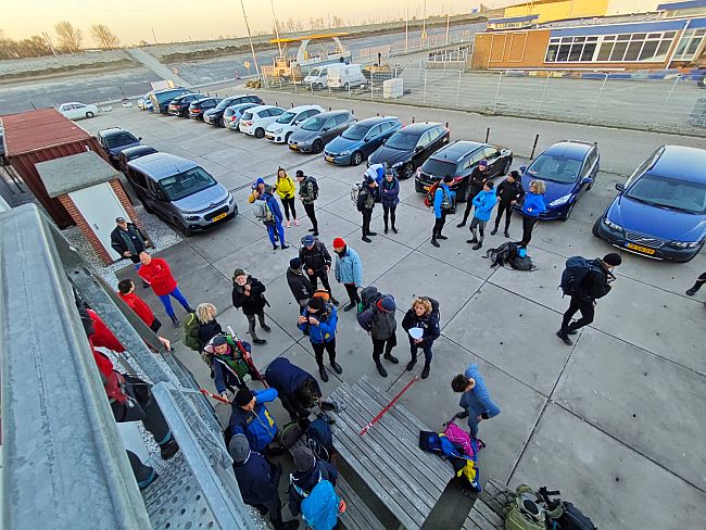 Deelnemers aan de reddingsoefening verzamelen zich rond 06:30 uur bij het kantoor van St. Wadloopcentrum Pieterburen te Lauwersoog.