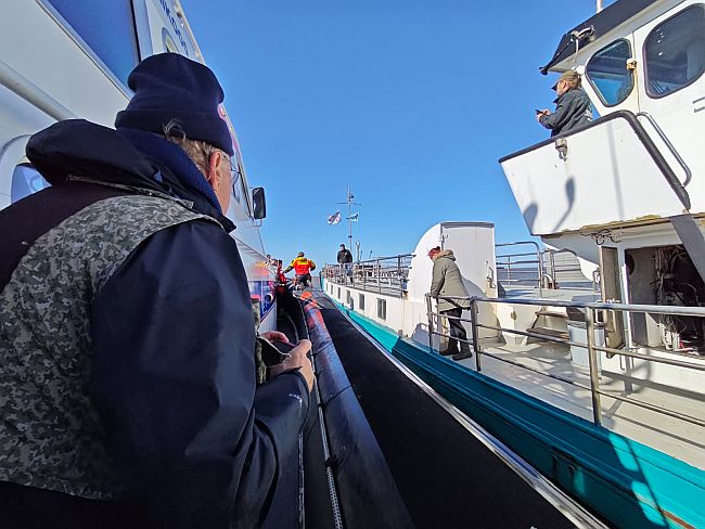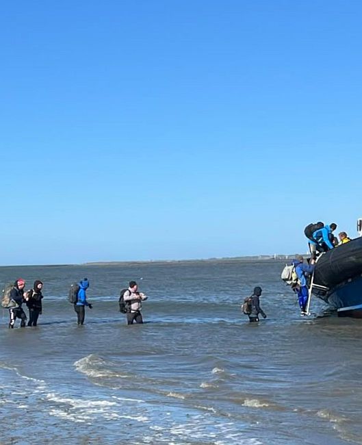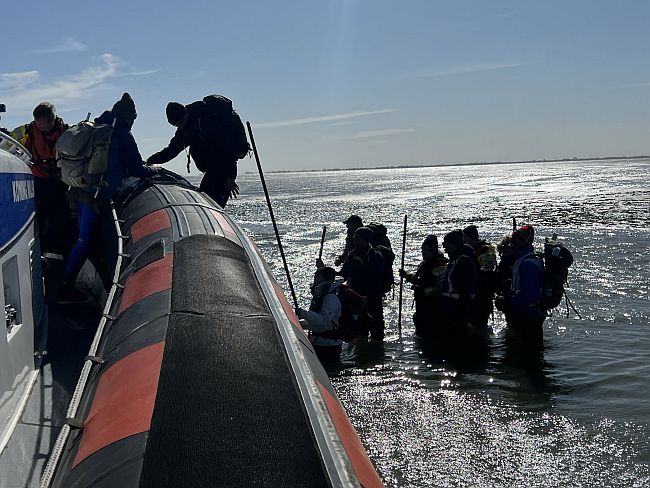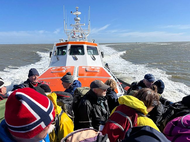 Wadlopers klimmen aan boord van een van de reddingboten. De ladder is wat aan de korte kant.