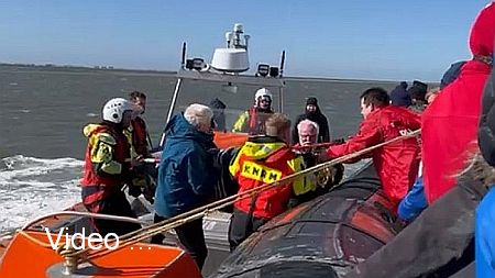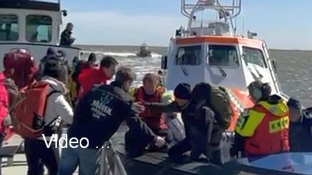Wadlopers klimmen aan boord van een van de reddingboten.