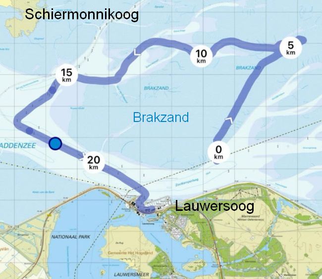 De track van de wadlopers op de zandbank Brakzand en van de reddingsboten naar Lauwersoog.