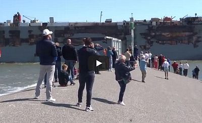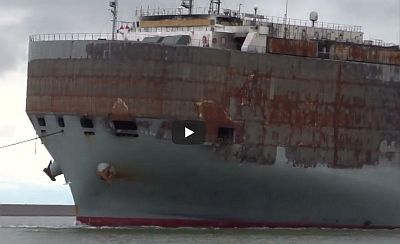 en video's over aankomst en vertrek van de uitgebrande autocarrier Freemantle Highway in de Eemshaven,