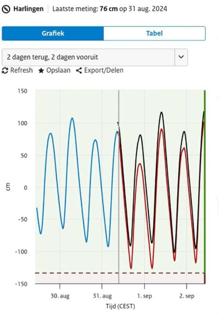 Het astronimisch en verwacht tij op de dag dat we vanaf Koehool vertrekken.