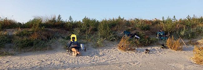 Zo sukkelen we met het windje in de rug voort en na exact vier uur over het Wad te hebben gelopen zetten we voet op de oostpunt van Griend. We schudden elkaar de hand, als waren we ontdekkingsreizigers die hun expeditie succesvol afronden. De zon schijnt nog altijd weelderig en we nemen plaats aan de zuidkant van de oostelijke duintjes om het vervullen van de glorieuze tocht te vieren. Zo zitten we een paar uurtjes in de dalende zon, drinken van onze biertjes en eten wat chips.