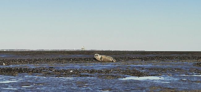 16:48 uur. Grijze zeehondenjong op het wad. Op de achtergrond het wadwachtershuis van Engelsmanplaat.