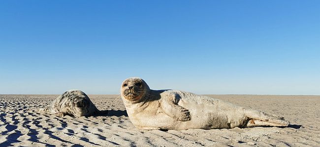 16:58 uur. Twee jonge zeehonden, links een grijze en rechts een gewone.