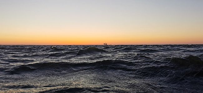 18:53 uur. Op de horizon het NAM-platvorm boven Ameland.