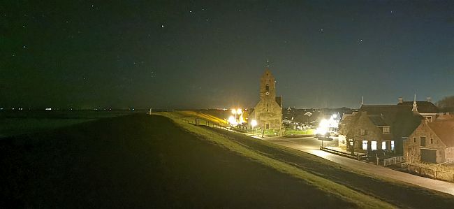 Aan de zuidkant lopend langs de waterlijn kan ik niet eens over Vin heen kijken, zo hoog is het hier lokaal geworden. Ik schat in zelfs hoger dan het Bultje nu zelf is. De zon is onder. De maan zal pas later opkomen. De sterren verschijnen langzaam aan een heldere hemel. De temperatuur is inmiddels gedaald tot een paar graden boven het vriespunt. Toch is het niet zo duister dat ik mijn hoofdlampje nodig heb. Ik ben ruim op tijd voor het opkomende water en ik kan eenvoudig naar Wierum lopen, waar na het afspoelen in de sloot het oude en vertrouwde kerkje 9 uur slaat.