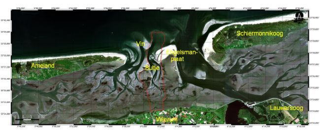 Rode lijn: track van de 23 km lange tocht op het wad en de buitendelta van het Smerig Gat tussen Ameland en Schiermonnikoog.