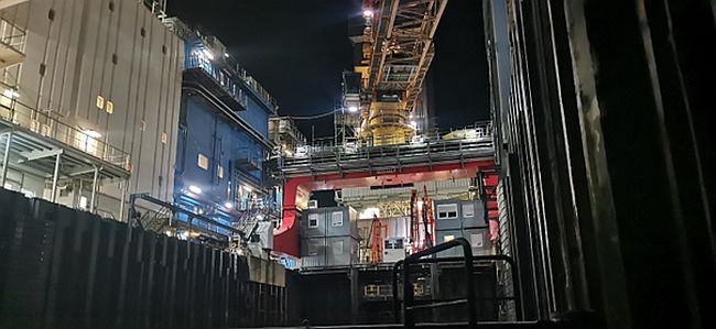Op de terugweg waag ik een bezoek aan het eiland Mittelplate A. Het voelt als een zeer spannende onderneming omdat het platform nog operationeel is en vol belicht is. Als ik ongezien naast de torenhoge stalen damwanden van het eiland sta, weet ik dat ik vanaf boven moeilijk zichtbaar ben. Ik voel me dan ook relatief veilig, ook al sta ik vlak naast dit kunstmatige eiland.