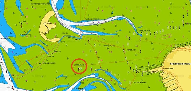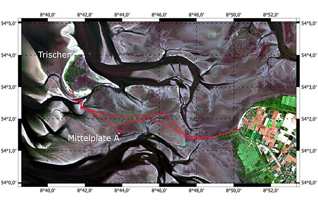 Figuur 1: kaart met links Trischen; middenonder Mittelplate A en rechts het Duitse vasteland.