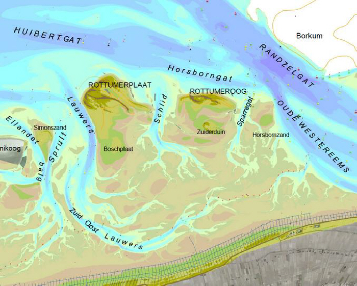 Overzichtskaart Rottumerplaat en Rottumeroog met geulen