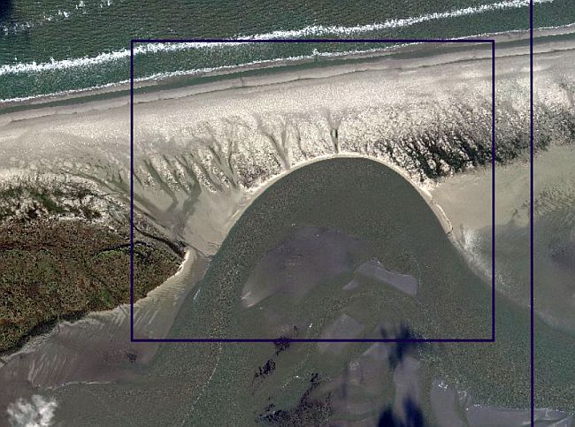 Satellietopname van de oostpunt van Schiermonnikoog, waar de Eilander Balg vermoedelijk vroeg of laat door het