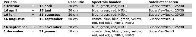 Het huidige contract voor optische satellietdata liep eind januari 2026 af. Er is een nieuw contract afgesloten voor levering van optische satellietdata vanaf 1 februari 2026 voor minimaal 3 jaar. Dit betekent dat de beschikbaarheid van de optische data minimaal doorloopt t/m januari 2029. Daarna kan het contract met nog eens 3 keer een jaar worden verlengd tot uiterlijk januari 2032, afhankelijk van beschikbaar budget en mate waarin de data nog aansluiten op gebruikersbehoeften.
