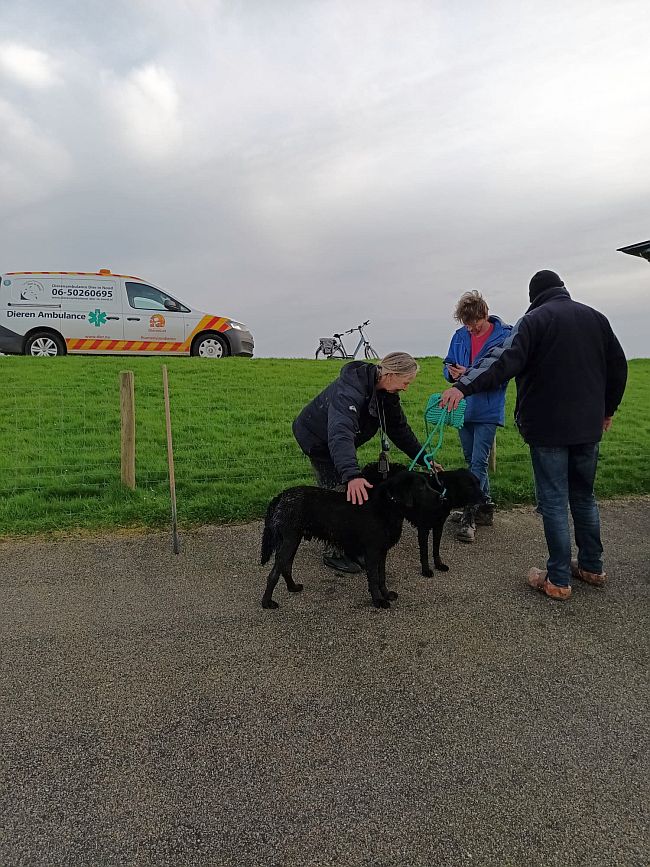 Een passerende heer wist door op zijn vingers te fluiten de aandacht van de honden te trekken, ze kwamen naar de zeedijk