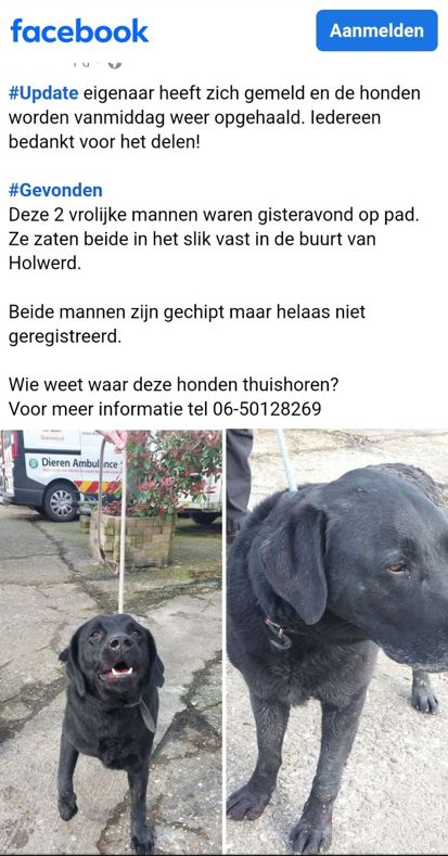 Oproep en update op Facebook, een van beide honden staat op de foto.