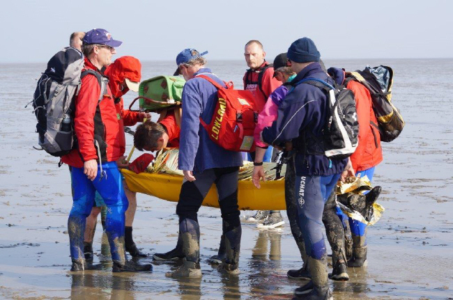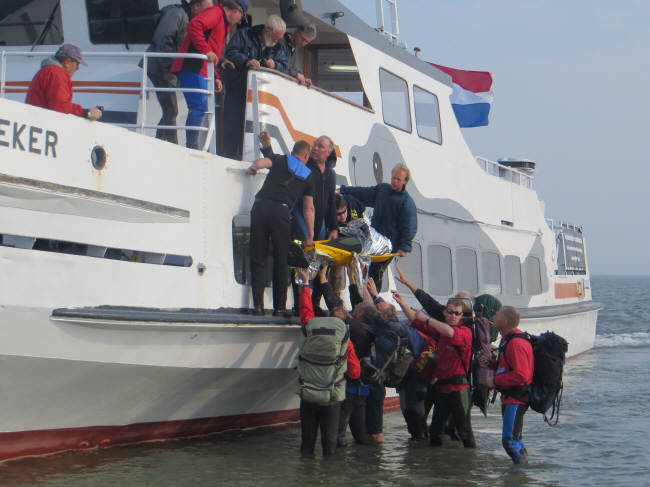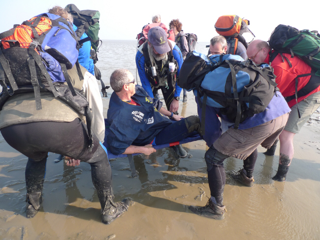 Een wadloper op het Pieterburen Wad kan niet meer lopen en wordt op een brancard gelegd.