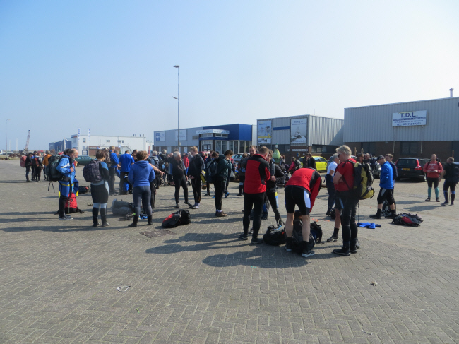 De wadlopers voor aanvang van de reddingsoefening op de kade te Lauwersoog.
