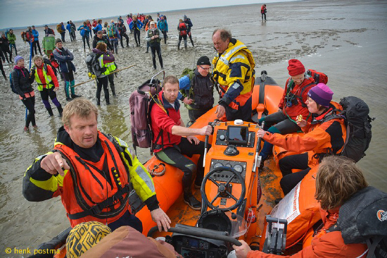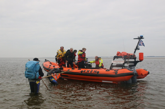 De verdwaalde wadlopers gaan aan boord van de reddingboot.