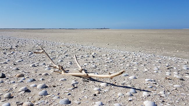 Takje en schelpen op de Hengst met op de achtergrond de vuurtoren van Texel