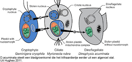 Er zijn aanwijzingen dat veel fotosynthetiserende dinoflaggelaten plantaardige celorganen van hun prooi insluiten en gebruiken alsof het hun eigen organen zijn. In laboratoriumstudies met Dinophysis acuminata, de meest voorkomende soort langs de Europese kusten, is gebleken dat orgaanroof voor deze 'alg' de normale manier van eten is. Zij stelen bladgroenkorrels van trilhaardiertjes, die ze op hun beurt weer hebben gestolen van algen. Dinophysis acuminata kan maandenlang leven op een eenmaal goed ingebouwde bladgroenkorrel.