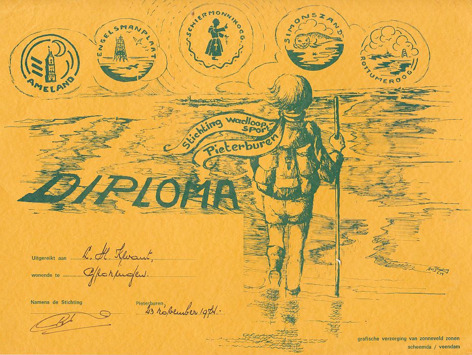 Voorbeeld van het grote wadloopdiploma van Stichting Wadloopsport Pieterburen, november 1974.