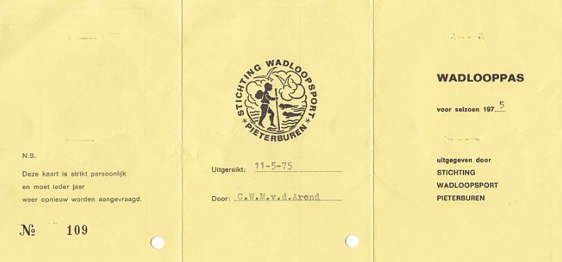 Voorbeeld van een Wadlooppas van Stichting Wadloopsport Pieterburen, kalenderjaar 1975.