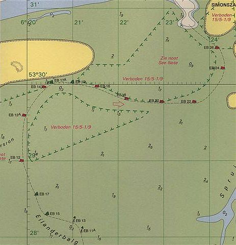 GARMERWOLDE - Op de nieuwe Hydrografische Kaart Waddenzee Oostblad ed. 2005 staat op kaart 1812.4 de Eilanderbalg tussen Schiermonnikoog en Simonszand geheel met groene ondergrond weergegeven (zie afbeelding).