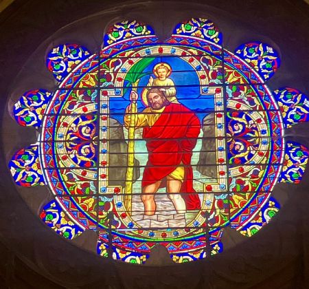 Glas-in-loodraam boven het altaar van de St. Christoffelkerk te Peyre, Zuid Frankrijk.